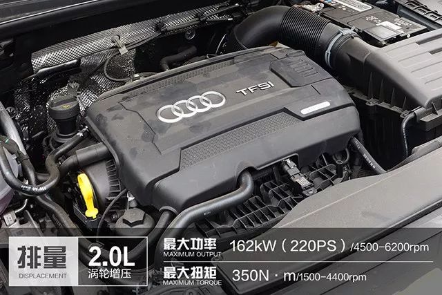 全新奥迪Q3给消费者准备了1.4T与2.0T发动机车型,其中1.4T车型搭载了我们熟悉的代号EA211发动机,最大功率110kW,最大扭矩250N•m;2.0T车型搭载了著名的EA888发动机,低功率版本最大功率137kW,最大扭矩320N•m,而高功率车型最大功率可达162kW,最大扭矩达到350N•m。与发动机匹配的是7速S-tronic双离合变速箱。采用MQB平台打造的全新奥迪Q3采用了前麦弗逊独立悬挂,后多连杆独立悬挂的组合。