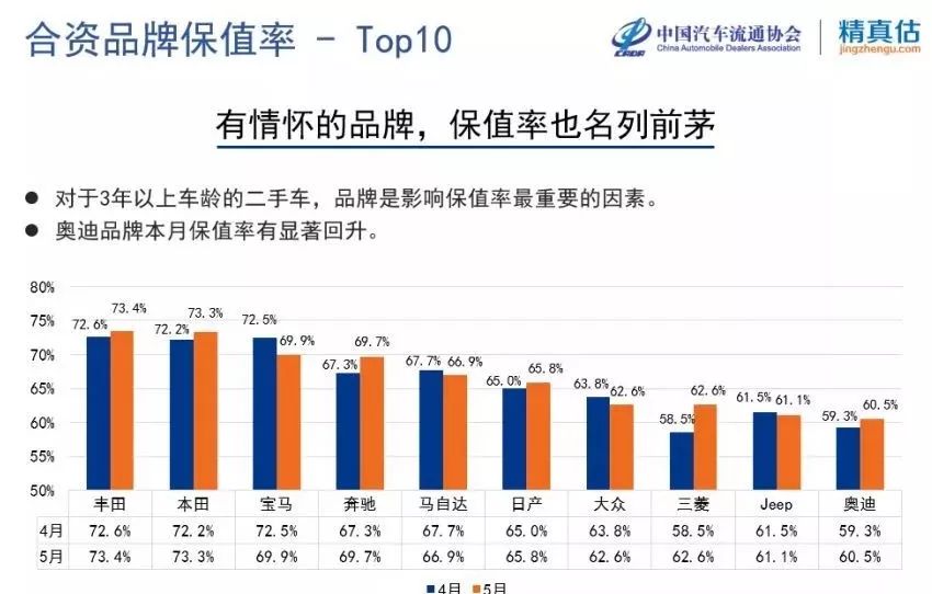 按品牌区分的话,合资品牌的丰田、本田以及宝马分别占据榜单的前三甲。其中丰田与本田的保值率都能保持在70%以上,简直就是二手市场中的“理财产品”。