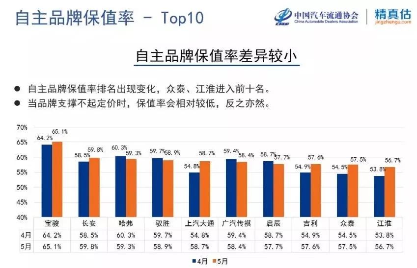 暂时买不起宝马的也不要灰心,在自主品牌的保值率排行榜中,宝马的“中国表弟”——宝骏,稳坐在了自主品牌保值率的头把交椅上。65.1%的保值率已经跟合资品牌中的日产、大众之流不相上下,表现十分优秀。