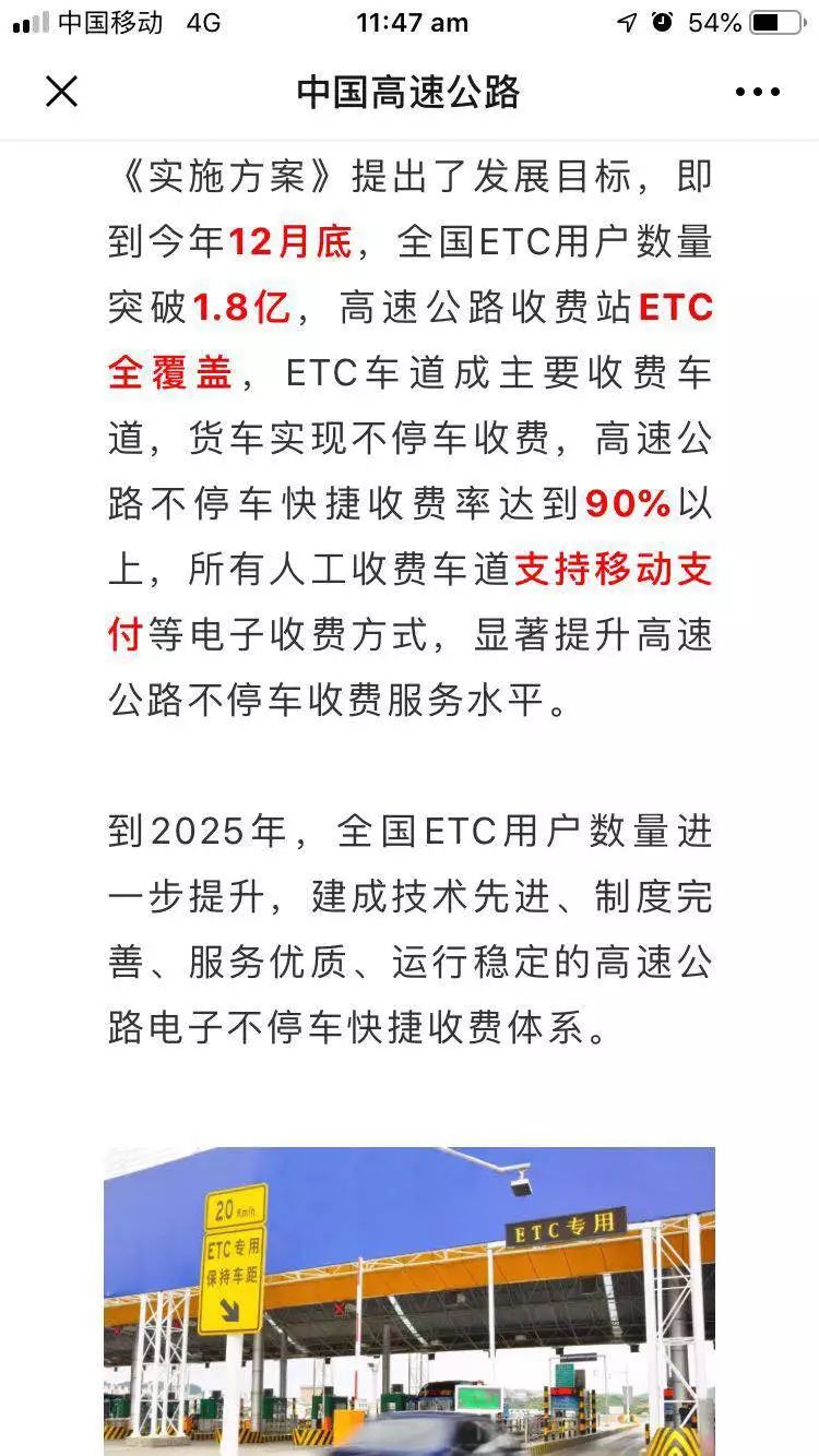 而且,文件中还提到,必须在大中城市以及旅游景区,实现ETC车道占比不低于70%的目标。今后的高速通行优惠减免政策,也将依托ETC系统来实施。