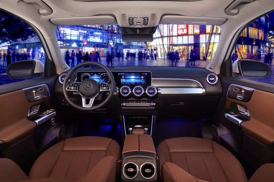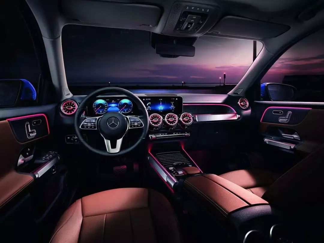 与A-Class同平台打造的GLB内饰也是同样酷炫,双联屏加飞机发动机样式的空调出风口让人百看不厌。副驾驶前方模仿硬派越野车扶手的金属饰条也是同样质感满满。