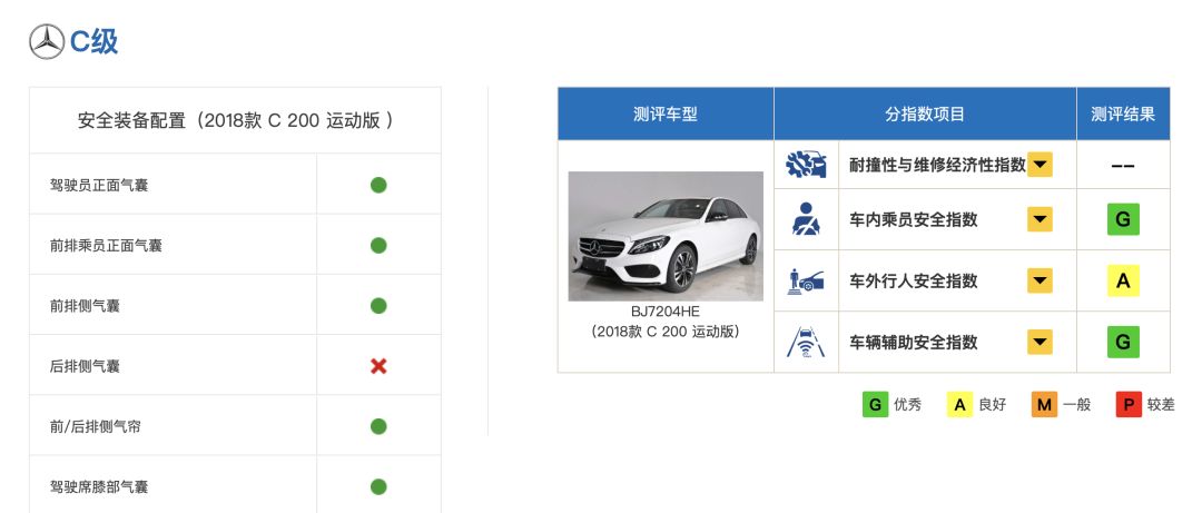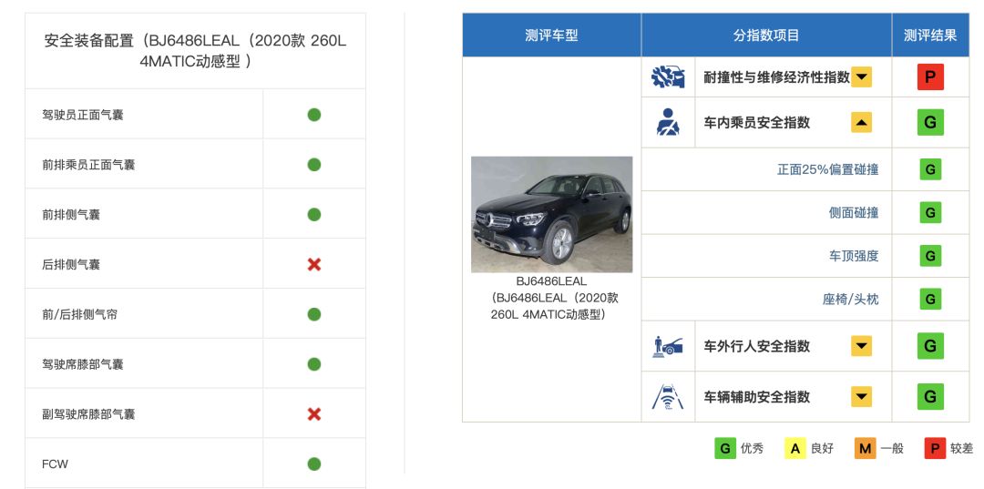 值得关注的是车内乘员安全指数。这也是众多车型在中保研的测试体系下铩羽而归的一项测试科目。而奔驰GLC在该项测试科目的考验下获得了全优评价,包括令众多车企闻风丧胆的正面25%偏置碰撞;以及常规的侧面碰撞和车顶强度、座椅/头枕测评结果均为优秀(G)。