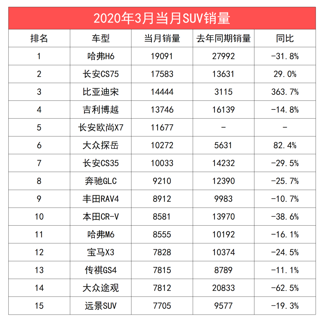 自主全面超越合资的SUV榜单