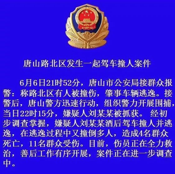 6月6日晚,河北省唐山市发生一起驾车撞人事故,事故造成4人死亡11人受伤。犯罪嫌疑人于当晚被公安机关抓获,目前已被依法刑事拘留。...[详细]