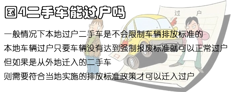 国4二手车能过户,因为一般情况下本地过户二手车是不会限制车辆排放标准的,本地车辆过户只要车辆没有达到强制报废标准就可以正常过户。但如果是从外地迁入的二手车,则需要符合当地实施的排放标准政策才可以迁入过户。