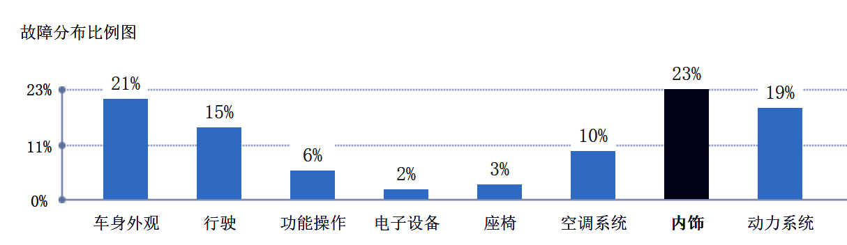 ◉内饰问题(23%):主要表现为仪表板及车门内饰板异响、明显磨损或损坏。