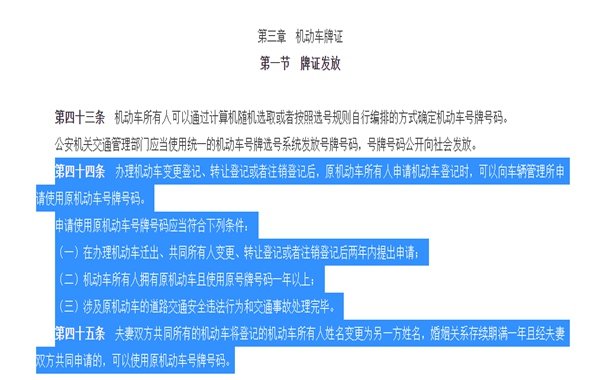 还有第四十五条,夫妻双方共同所有的机动车将登记的机动车所有人姓名变更为另一方姓名,婚姻关系存续期满一年且经夫妻双方共同申请的,也可以使用原机动车号牌号码。