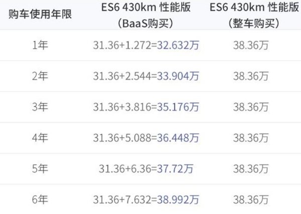 虽然目前不能够确定通过BaaS购买的新车保值率能不能达到与燃油车一样的水平。但可以肯定的是,其保值率一定会比ES6整车的保值率要高。这样看来,使用BaaS服务购买,在后期换车时能够将损失降低不少。