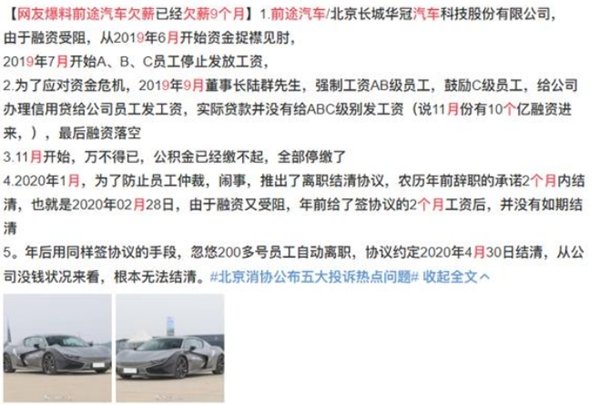 在造车资金紧缺的局面下,前途汽车/长城华冠开始停发员工薪资。截至目前,前途汽车及母公司长城华冠共推出三份离职结清协议书。且在曝出公司欠薪后,前途汽车董事长陆群也被法院实行限制消费令。