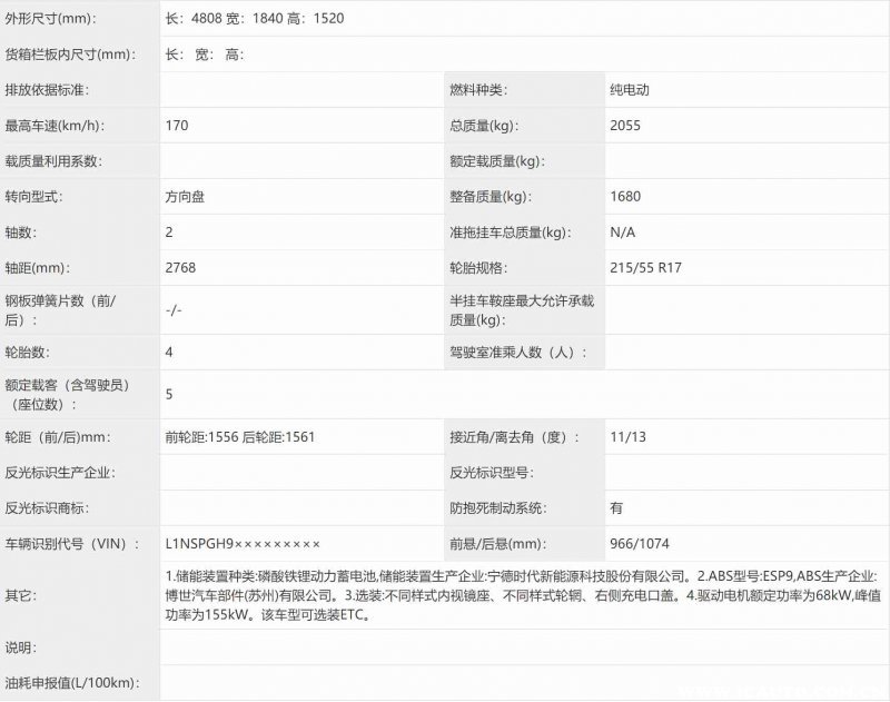 动力方面,小鹏N5采用了型号为TZ228XS68D5的驱动电机,额定功率68kW,峰值功率155kW,最高车速可达170km/h。蓄能装置是宁德时代提供的磷酸铁锂电池组,具体的电池容量和续航里程暂未公布。