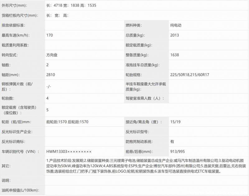 申报信息显示,威马E5的长度是4718mm,宽度是1838mm,高度是1535mm,轴距是2810mm,这样的长度和轴距比例很有意思,预计威马E5实车给人的感觉会是看上不大但内部空间很宽敞。