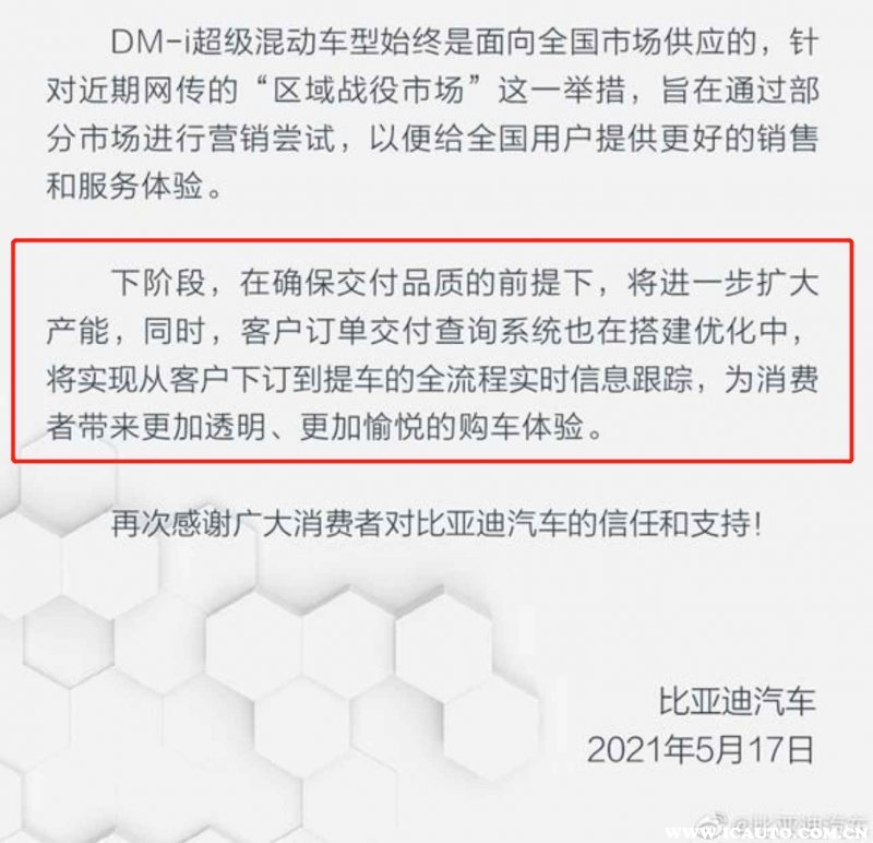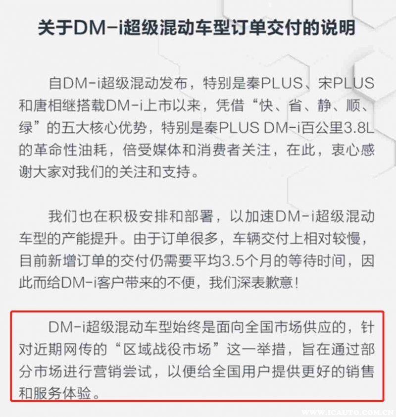 比亚迪官方曾发布过一份说明回应,其称“针对近期网传的“区域战役市场”这一举措,旨在通过部分市场进行营销尝试,一边给全国用户提供更好的销售和服务体验。”