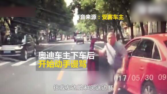 在前车拐歪后,奥迪司机边骂街边把前车别停,接着该司机下车过来抽打前车司机头部、脸部,并叫骂“我抽死你,你不加油是吧!你是不是想死……”