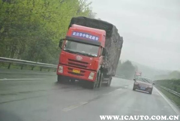 第四、尽量不要在大型车辆旁行驶