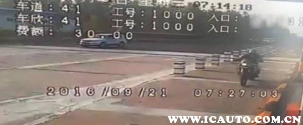 我们可以从监控画面看出,张小光驾驶一辆BMW F800GS摩托车跟在一辆轿车后面,经过无人看守ECT出口。前车通过后小光向加速通过但不幸被档杆砸中,悲剧就此发生。