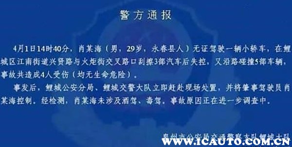 从视频监控可以看出,当时车辆行驶速度非常快,在鲤城区江南街道兴贤路与火炬街交叉路口刮擦3部汽车后失控,又沿路碰撞5部车辆,受损车辆共8辆。所幸并没有造成人员死亡,男子肖某海未涉及酒驾、毒驾,但属于无证驾驶,正在接受进一步调查。