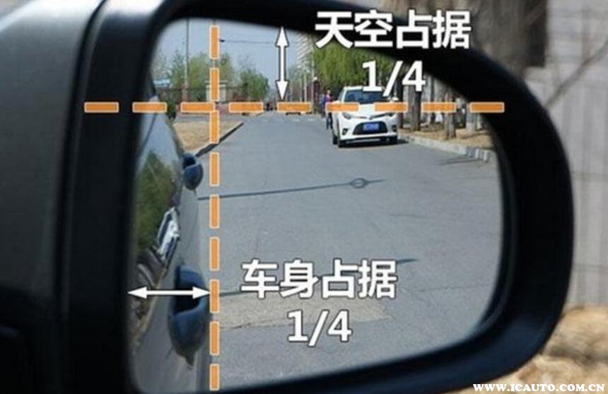 2、其次调节右侧后视镜,由于右边的汽车后视镜跟驾驶员距离相隔有些远,因此需要减少天空占据的空间。最好是把后视镜空间都留给车身侧面的位置,因此右侧汽车的后视镜,天空只需要占据四分之一,同时车身占据的比例也是四分之一。