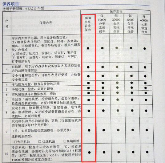 从官方保养手册中可以看到,朗逸行驶到5000公里时进行首次保养,保养的内容包括车身内外照明电器、自诊断、安全气囊和安全带、多功能方向盘等等,详情见下图: