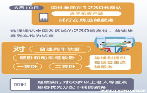 近期,据官方信息透露,国铁集团将在12306网站(含手机客户端)试行在线选铺服务,选择通达全国各区域的230趟高铁、普速旅客列车作为试点,对普速列车软卧、硬卧和动车组软卧、一等卧、二等卧等铺别提供在线自主选铺服务,同时,继续实行对60岁以上老人等重点旅客优先分配下铺的服务。