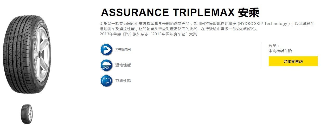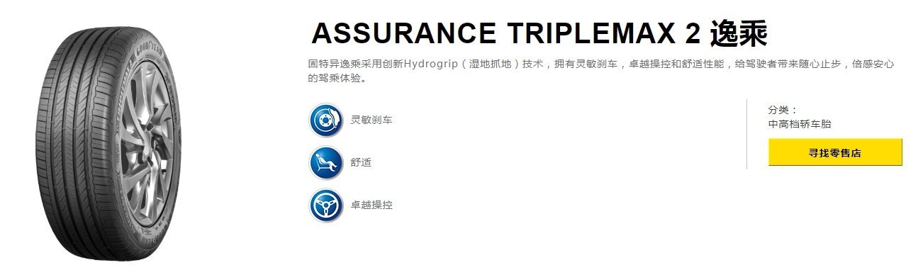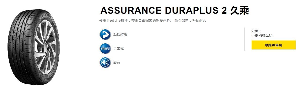 Assurdnce是一款来自美国的固特异轮胎旗下的产品,包括了Assurdnce duraplus2久乘、Assurdnce Triplemax2逸乘、Assurdnce Triplemax安乘等三个系列产品。其中久乘强调的是坚韧耐用、长里程、静音的特性;逸乘强调的是卓越操控、灵敏刹车、舒适的特性;安乘强调的是坚韧耐用、湿地性能、节油性能。
