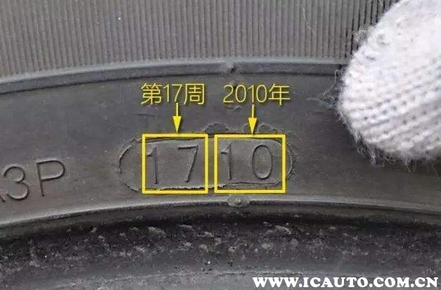 轮胎生产日期通常刻印在轮胎侧面,在安装轮胎时要求日起朝外方便观看,如果没找到那就表明轮胎装反了。生产日期由四个数字组成,前两位代表的是生产周,后两位是生产年。如上图所示的1710代表的是10年第17周生产。