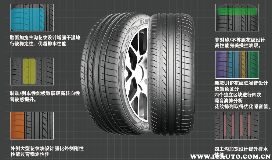 至于产品力度方面,就拿最新发售的KR41轮胎最为例子吧。在胎面的部分,采用了加宽主沟花纹(不对称)的设计,不仅加强了干湿地行驶稳定性,而且还有着非常出色的破水膜能力。其次,KR41轮胎还运用了新款UHP花纹低噪音设计,从而有效地抵消行驶时的胎噪,提供相当舒性的乘车环境。还有就是外侧大型花纹快设计,这样一来即使在急转弯的时候,车身也能保持很好的稳定性。