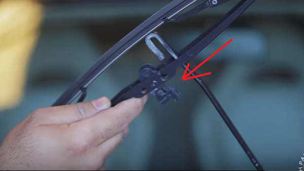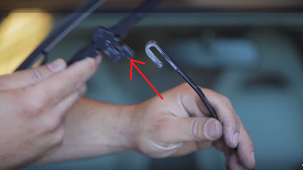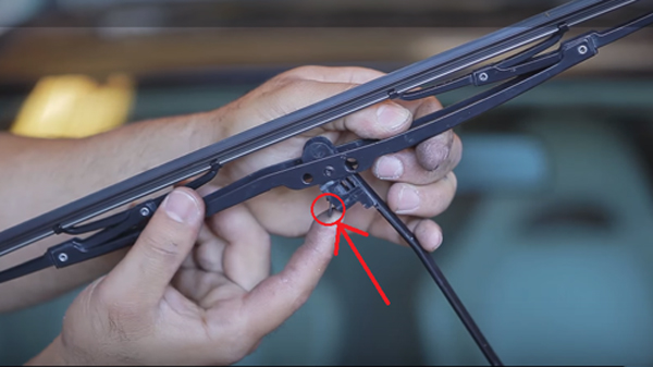 3、在雨刮片和雨刮臂连接的地方找到固定的卡扣。