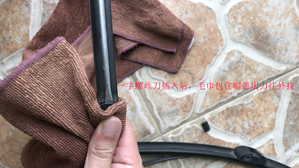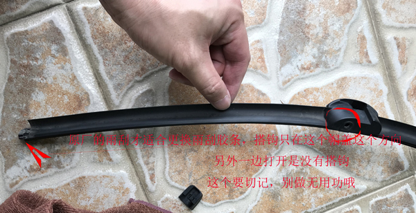 7、接着更换雨刮器胶条,注意图示帽盖方向才有搭钩,另一边是没有的。