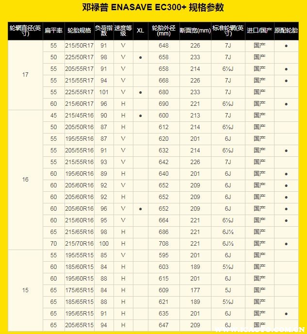 enasave ec300+涵盖15寸至17寸,共计18个规格,并成功配套日产新蓝鸟、新帕萨特、新迈腾、大众凌渡、卡罗拉等市场多款主流车型,以满足客户对于节油环保型轮胎的需求。